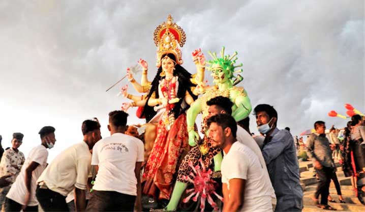 বৃষ্টি আর চোখরে জলে ভজিে গছেে কক্সবাজাররে বালুকাবলো। ঢাক-ঢোল, শঙ্খধ্বনি আর ভক্তমিূলক গানরে তালে সনাতন র্ধমাবলম্বীরা দবেী র্দুগাকে বদিায় জানালনে সমুদ্ররে লোনাজল।ে বৃহস্পতবিার (২ অক্টোবর) সন্ধ্যার আগইে প্রতমিা বর্সিজনরে মধ্য দয়িে সমাপ্তি ঘটল সনাতন র্ধমাবলম্বীদরে সবচয়েে বড় র্ধমীয় উৎসব র্দুগোৎসবরে।