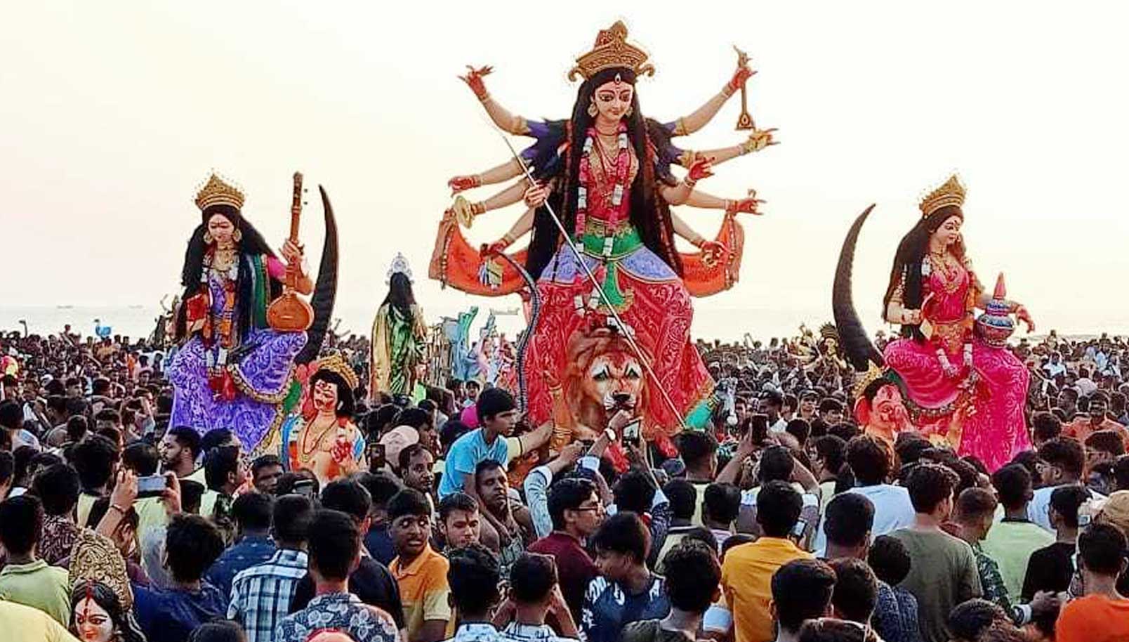 বৃষ্টি আর চোখরে জলে ভজিে গছেে কক্সবাজাররে বালুকাবলো। ঢাক-ঢোল, শঙ্খধ্বনি আর ভক্তমিূলক গানরে তালে সনাতন র্ধমাবলম্বীরা দবেী র্দুগাকে বদিায় জানালনে সমুদ্ররে লোনাজল।ে বৃহস্পতবিার (২ অক্টোবর) সন্ধ্যার আগইে প্রতমিা বর্সিজনরে মধ্য দয়িে সমাপ্তি ঘটল সনাতন র্ধমাবলম্বীদরে সবচয়েে বড় র্ধমীয় উৎসব র্দুগোৎসবরে।