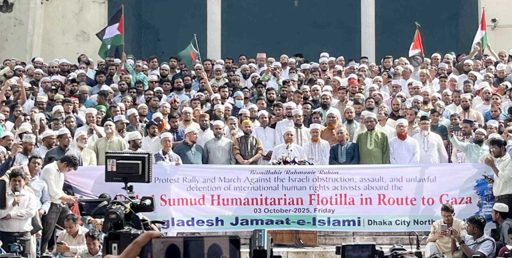 আজ শুক্রবার জাতীয় মসজিদ বায়তুল মোকাররমের উত্তর গেটে জামায়াতে ইসলামী ঢাকা মহানগর উত্তর ও দক্ষিণ শাখার যৌথ উদ্যোগে এক বিক্ষোভ সমাবেশ অনুষ্ঠিত হয়। সম্প্রতি ইসরায়েল কর্তৃক আন্তর্জাতিক মানবিক ত্রাণবাহী নৌবহর আটক এবং এতে অংশগ্রহণকারী কর্মীদের আটকের ঘটনার প্রতিবাদে এ সমাবেশের আয়োজন করা হয়।