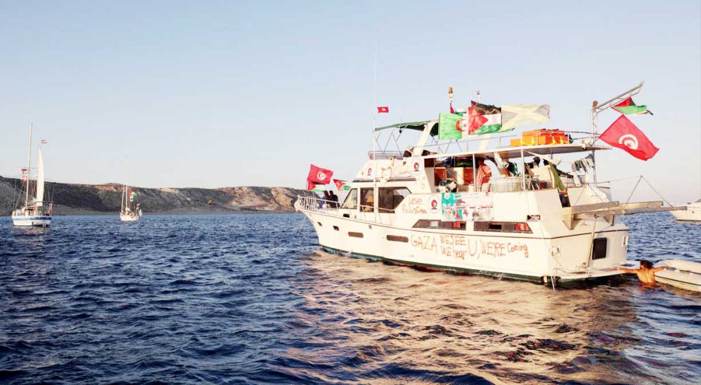 ইসরায়েলি সেনাবাহিনী ভূমধ্যসাগরের আন্তর্জাতিক জলসীমায়, গাজা উপকূল থেকে ১২০-১২৯ কিলোমিটার দূরে নৌবহরটিকে বাধা দেয় এবং বেশ কয়েকটি জাহাজে উঠে অধিকারকর্মীদের আটক করে।