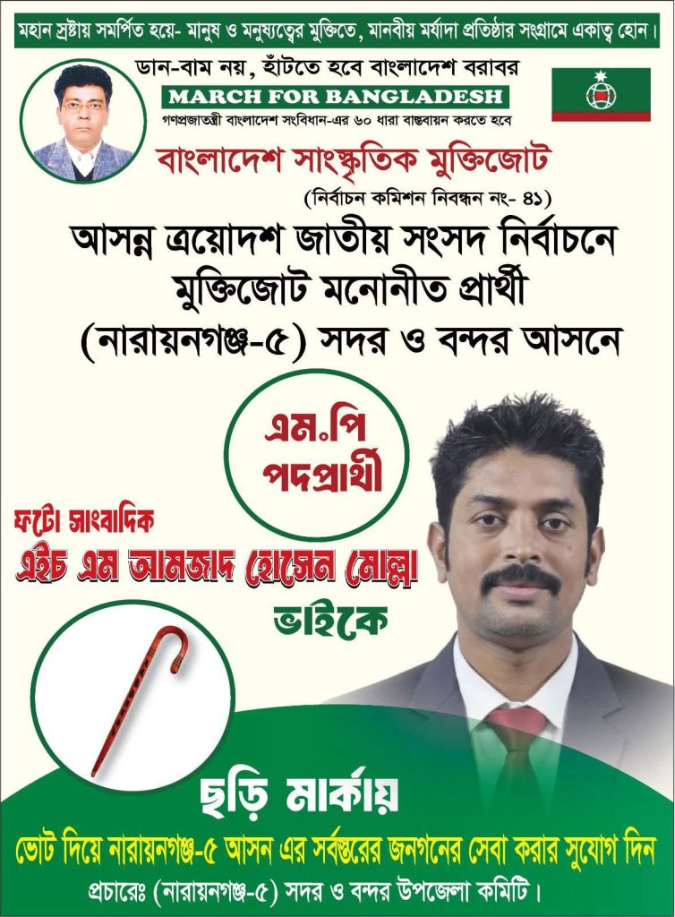 নারায়ণগঞ্জ–৫ আসনের সংসদ সদস্য পদে নির্বাচনে প্রতিদ্বন্দ্বিতার জন্য মুক্তিজোট (বাংলাদেশ সাংস্কৃতিক মুক্তিজোট) থেকে মনোনয়ন গ্রহণ করেছেন ঢাকা২৪নিউজ এবং সরেজমিন বার্তার ফটোসাংবাদিক এইচ. এম. আমজাদ হোসেন মোল্লা। শনিবার সংগঠনটির কেন্দ্রীয় নেতৃবৃন্দের উপস্থিতিতে তাকে আনুষ্ঠানিকভাবে ‘ছড়ি প্রতীক’র মনোনয়নপত্র তুলে দেওয়া হয়।