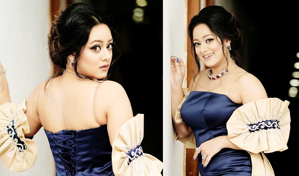মুগ্ধ ভক্তরা মোহনীয় দীঘি নীল-সোনালী গাউনে