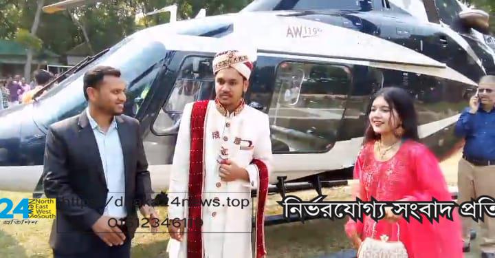 আমি তাঁর কাছে অশেষ শুকরিয়া আদায় করছি।”স্থানীয়রা জানান,গ্রামাঞ্চলে এমন ব্যতিক্রমী আয়োজন খুবই বিরল। হেলিকপ্টারে বউ আনার ঘটনাটি এলাকাবাসীর কাছে এক আনন্দঘন ও স্মরণীয় মুহূর্ত হয়ে থাকবে। এদিকে,এমন আয়োজনকে ঘিরে নবদম্পতি ও তাদের পরিবারকে শুভেচ্ছা জানিয়েছেন স্থানীয় জনপ্রতিনিধি ও গণ্যমান্য ব্যক্তিরা। শরিফের বাবার দীর্ঘদিনের স্বপ্নপূরণের এই গল্প এখন পুরো এলাকায় আলোচনার কেন্দ্রবিন্দুতে পরিণত হয়েছে।