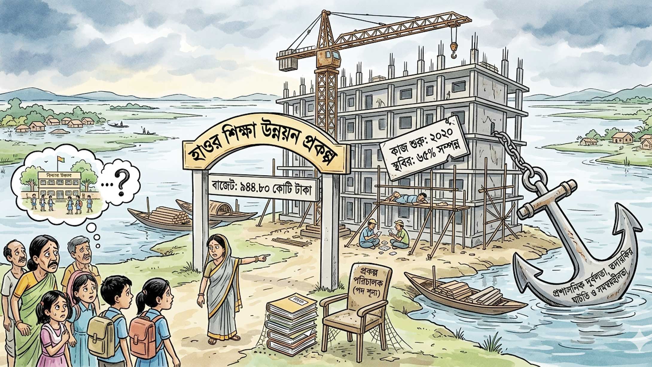 হাওরাঞ্চলের শিক্ষা ব্যবস্থার কাঠামোগত উন্নয়ন এবং পিছিয়ে থাকা জনপদে আধুনিক শিক্ষার পরিবেশ গড়ে তুলতে নেওয়া বড় বাজেটের একটি সরকারি প্রকল্প বাস্তবায়নের মাঝপথে এসে গতি হারিয়েছে। প্রায় ৯৪৪ কোটি ৮০ লাখ টাকা ব্যয়ে পরিচালিত ‘হাওর এলাকার নির্বাচিত শিক্ষা প্রতিষ্ঠানসমূহের উন্নয়ন (প্রথম সংশোধিত)’ প্রকল্পটি এখন কার্যত স্থবির অবস্থায় রয়েছে বলে সংশ্লিষ্ট সূত্রে জানা গেছে। পরিকল্পনা কমিশনের পরিবীক্ষণ সূত্র বলছে, নভেম্বর ২০২৫ পর্যন্ত প্রকল্পটির অগ্রগতি সন্তোষজনক থাকলেও এরপর মাঠপর্যায়ে কাজের গতি উল্লেখযোগ্যভাবে কমে যায়। বর্তমানে প্রায় ৬৫ শতাংশ কাজ সম্পন্ন হলেও বাকি অংশ শেষ করার বিষয়ে অনিশ্চয়তা তৈরি হয়েছে।