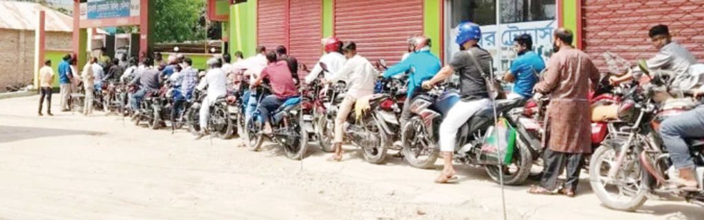 প্রায় ৯ ঘণ্টা লাইনে দাঁড়িয়ে থাকার পুরো সময়টাই তিনি মোটরসাইকেলের ওপর বসে কাটিয়েছেন। সেখানেই সেরেছেন সকালের নাশতা ও দুপুরের খাবার। কিন্তু দিনশেষে তেল তো দূরের কথা, ভাগ্যে জুটেছে শুধু হতাশা।