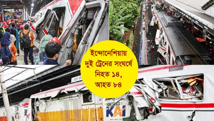 ইন্দোনেশিয়ার রাজধানী জাকার্তার উপকণ্ঠে ভয়াবহ ট্রেন দুর্ঘটনায় অন্তত ১৪ জন নিহত এবং ৮৪ জন আহত হয়েছেন। দুই ট্রেনের মুখোমুখি সংঘর্ষের পর ঘটনাস্থলে সৃষ্টি হয় হৃদয়বিদারক পরিস্থিতি। দুর্ঘটনার পরপরই উদ্ধারকর্মীরা ধ্বংসস্তূপে আটকে পড়া যাত্রীদের উদ্ধারে ব্যাপক অভিযান শুরু করেন। দেশটির রাষ্ট্রায়ত্ত রেল সংস্থা কেএআই (KAI) জানিয়েছে, দুর্ঘটনাটি ঘটে জাকার্তা থেকে প্রায় ২৫ কিলোমিটার দূরে বেকাসি এলাকার একটি রেলপথে। স্থানীয় সময় রাতের দিকে একটি দূরপাল্লার ট্রেন দাঁড়িয়ে থাকা কমিউটার ট্রেনকে সজোরে ধাক্কা দিলে এ দুর্ঘটনা ঘটে।
