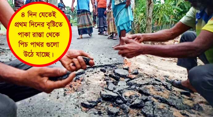 মঙ্গলবার (২৮ এপ্রিল) বিকেল ৫টার দিকে ভোলাবাজার এলাকায় জড়ো হয়ে ক্ষোভ প্রকাশ করেন স্থানীয় বাসিন্দারা। তারা জানান, গত ২৪ এপ্রিল শুক্রবার জুমার নামাজের সময় তড়িঘড়ি করে ঠিকাদারের লোকজন এসে খুব অল্প সময়ে কাজ শেষ করে চলে যায়। যথাযথ প্রস্তুতি বা মান নিয়ন্ত্রণ ছাড়াই শুধু নামমাত্র পিচ ও পাথর ফেলে কাজটি সম্পন্ন করা হয়েছে বলে দাবি করেন তারা। স্থানীয়দের অভিযোগ, কাজের সময় কোনো ধরনের তদারকি বা মান যাচাই হয়নি। নামাজ শেষে এলাকাবাসী এসে সড়কের অবস্থা দেখে বিস্মিত হন এবং মোবাইল ফোনে বিষয়টি ধারণ করে সামাজিক যোগাযোগমাধ্যমে ছড়িয়ে দেন। এরপর রোববার রাতের বৃষ্টির পর পরিস্থিতি আরও খারাপ হয়ে যায়। পরদিন সকালে দেখা যায়, সড়কের বিভিন্ন স্থানে পিচ উঠে গিয়ে নিচের স্তর বেরিয়ে পড়েছে।
