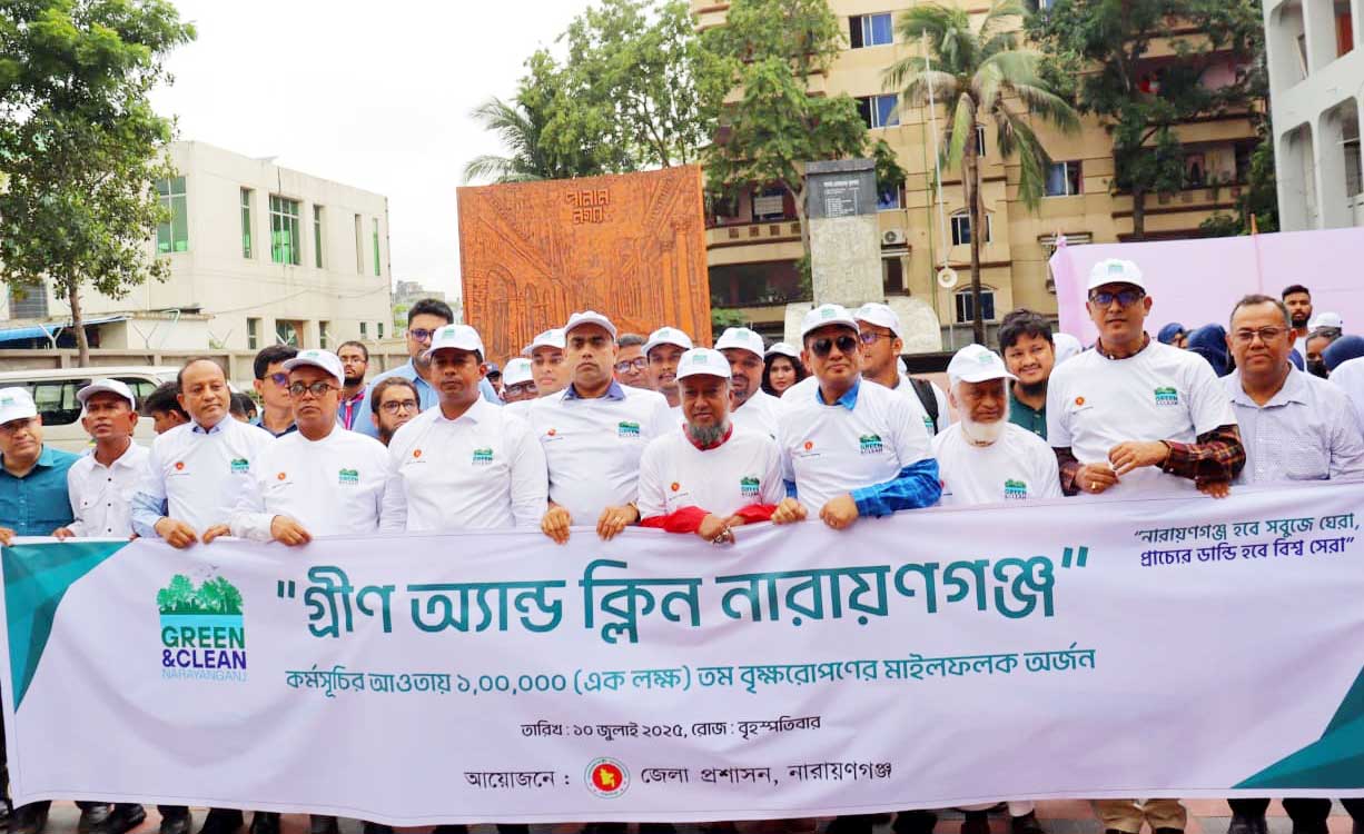 “নারায়ণগঞ্জ হবে সবুজে ঘেরা, প্রাচ্যের ডান্ডি হবে বিশ্ব সেরা”—এই প্রত্যয়ে শুরু হওয়া ‘গ্রিন অ্যান্ড ক্লিন নারায়ণগঞ্জ’ কর্মসূচির আওতায় বৃহস্পতিবার সকালে সাইনবোর্ড এলাকায় এক লক্ষতম গাছের চারা রোপণ করা হয়েছে। জেলা প্রশাসক ও বিজ্ঞ জেলা ম্যাজিস্ট্রেট মোহাম্মদ জাহিদুল ইসলাম মিঞা আনুষ্ঠানিকভাবে এই ঐতিহাসিক বৃক্ষরোপণের উদ্বোধন করেন। পরিবেশবান্ধব উন্নয়ন ও নগরায়ণের লক্ষ্যকে সামনে রেখে নারায়ণগঞ্জ জেলাকে সবুজ ও টেকসই শহরে রূপান্তরের অংশ হিসেবে এই উদ্যোগ বাস্তবায়িত হচ্ছে। উল্লেখযোগ্যভাবে, গত ১০ মে ঢাকা বিভাগের বিভাগীয় কমিশনার শরফ উদ্দিন আহমদ চৌধুরী আনুষ্ঠানিকভাবে কর্মসূচির উদ্বোধন করেন।