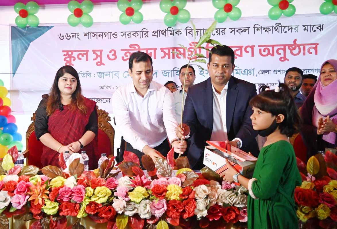 নারায়ণগঞ্জ সদর উপজেলার ৬৬ নং শাসনগাঁও সরকারি প্রাথমিক বিদ্যালয়ে অনুষ্ঠিত হয়েছে এক ব্যতিক্রমী ও মানবিক উদ্যোগ। ১০ জুলাই, বুধবার, জেলা প্রশাসনের তত্ত্বাবধানে বিদ্যালয়ের সকল শিক্ষার্থীদের মাঝে বিতরণ করা হয় স্কুল সু, ক্রীড়া সামগ্রী, চকলেট এবং গাছের চারা। অনুষ্ঠানে প্রধান অতিথি হিসেবে উপস্থিত ছিলেন নারায়ণগঞ্জের জেলা প্রশাসক ও জেলা ম্যাজিস্ট্রেট, জনাব মোহাম্মদ জাহিদুল ইসলাম মিঞা। সভাপতিত্ব করেন সদর উপজেলা নির্বাহী অফিসার মোহাম্মদ জাফর সাদিক চৌধুরী।