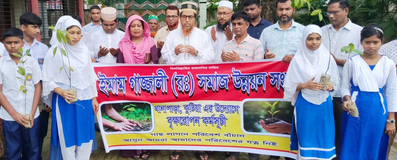 আজ ১৭ই জুলাই প্রতি বছরের ন্যায় ইমাম গাজ্জালী সমাজ উন্নয়ন সংস্থা কুষ্টিয়ার উদ্যোগে সাহিত্যিক মীর মোশাররফ হোসেন মাধ্যমিক বিদ্যালয়ে ও জিনিয়াস মডেল স্কুলের ছাত্র-ছাত্রীদের মাঝে তিনশটি বনজ,ফল ও ঔষধী গাছের চারা বিতরণ করা হয়। প্রধান অতিথি হিসেবে উপস্থিত ছিলেন কুষ্টিয়া জেলা শিক্ষা অফিসার মাওলানা এটিএম ইউনুস আলী। বিশেষ অতিথি হিসেবে উপস্থিত ছিলেন কুষ্টিয়া প্রেসক্লাবের সাবেক সভাপতি মুকুল খসরু, আঁকাবা নার্সারীর প্রোপাইটর ডাক্তার রুহুল আমিন,সংস্থার উপদেষ্টা হাজী আব্দুল মালেক রানা, কুষ্টিয়া সিটি কলেজের অধ্যাপক ওবায়দুর রহমান, আবরার ফাহাদ লাইব্রেরির পরিচালক রফিকুল্লাহ কালবি, জুলাই আন্দোলনে আহত সৈনিক তায়েফ হাসান খান ও শফিউল ইসলাম, বিশিষ্ট সমাজকর্মী কাজী সোহান শরীফ, একটু পাশে দাঁড়াই সংগঠনের নির্বাহী পরিচালক মোস্তাফিজুর রহমান সুমন।